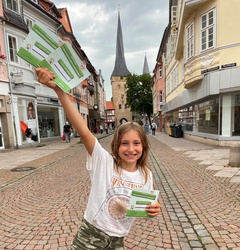 Ein Mädchen präsentiert das Stempelheft in der Innenstadt in Duderstadt. (Bild: Stadt Duderstadt).