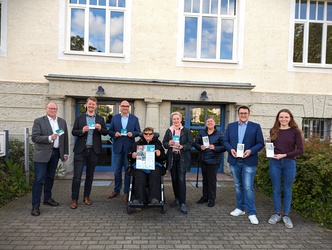 Das Bild zeigt: Jörg Dodenhöft (Stadt Northeim), Michael Eilers (Stadtmarketing Northeim), Simon Hartmann (Bürgermeister), Monika Nölting und Kira Royeck (Vorsitzende und stellvertretende Vorsitzende, Beirat für Menschen mit Behinderung der Stadt Northeim), Sylvia Binnewies (Stadt Northeim), Sebastian Penno (SPD) und Marie Wilp (Grüne). (Bild: Stadt Northeim)