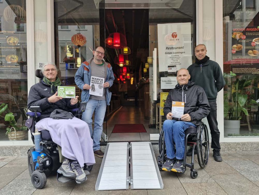 Kommt nach dem Göttinger Engagementpreis auch der Deutsche? Das Bild zeigt das Team um Marco Schnyder: Zu sehen ist von links nach rechts: Marco Schnyder, Erik Kleinfeldt (Verein Selbsthilfe Körperbehinderter), Benjamin Nowag Übungstrainer beim Rollitraining und Le Bao Khanh (Teilhaber Ginza Göttingen)