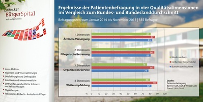 Das Einbecker BürgerSpital ist bei Patienten sehr beliebt. Das geht aus einer aktuellen Patientenbefragung der Krankenkassen AOK und Barmer GEK sowie des Portals „Weisse Liste“ hervor. In allen Qualitätsfragen liegt das BürgerSpital sowohl über dem Bundes- als auch Landesdurchschnitt für Niedersachsen. Die Qualitätsbeauftragte des Krankenhauses, Sibylle Stabnau, sieht das Ergebnis als Ansporn, um „im Sinne der Bürger auch weiterhin nah und persönlich eine qualitativ hochwertige Versorgung der Patienten anbieten zu können“. An der Befragung vom Januar 2014 bis November 2015 nahmen insgesamt 355 Patienten teil, deren Entlassung aus dem Krankenhaus mindestens zwei und maximal acht Wochen zurücklag. Die Patienten mussten 15 Fragen zur ärztlichen Versorgung, pflegerischen Betreuung und zum Ablauf und Service während des Aufenthalts beantworten. Besonders punkten konnte das BürgerSpital beim Thema „Weiterempfehlung“. Die Frage, ob die Befragten das Einbecker BürgerSpital ihrem besten Freund empfehlen würden, beantworteten 90 Prozent mit „ja“. Der niedersächsische Durchschnittswert liegt nur bei 80 Prozent.