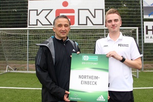 Der Stützpunktkoordinator des Deutschen Fußball-Bundes Kiriakos Aslanidis überreichte Northeims sportlichem Leiter Philipp Weißenborn am Rande des Trainings gestern Abend die entsprechende Plakette. (Bild: FC Eintracht Northeim)
