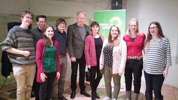 V. r. n. l.: Pippa Schneider (Kreisvorstand), Viola von Cramon (Kreisvorstandssprecherin), Ricarda Lang (Bundessprecherin Grüne Jugend), Marie Kollenrott (Stadtvorstand), Jürgen Trittin (Bundestagsabgeordneter), Dirk-Claas Ulrich (Stadtvorstand), Leonie Engelbert (Stadtvorstand), Valentin Büchi (Stadtvorstand), Konstantin Mallach (Stadtvorstand) (Bild: Lina Küther)