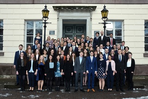 Medizinexamen bestanden: Die Absolventen des Medizinstudiums im Wintersemester 2017/2018 vor der Aula am Wilhelmsplatz. (Bild: Universität Göttingen)
