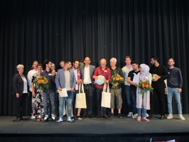 Alle Filmemacher: (ganz links im Bild die Organisatoren Ute Ahl, Samuel Loos und Wendy Ramola von der LEB und in der Mitte im grauen Anzug Christian Stadali (Moderation)). (Bild: LEB Niedersachsen)