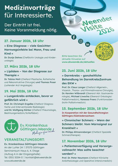 Auch in 2025 bietet das Ev. Krankenhaus Göttingen-Weende mit der Veranstaltungsreihe 'Weender Visite' sechs interessante Vorträge an. Die 'Weender Visite' ist eine Veranstaltungsreihe des Evangelischen Krankenhauses Göttingen-Weende. Die Vorträge geben Interessierten die Möglichkeit, mit den Experten des Krankenhauses aus verschiedenen medizinischen Fachrichtungen ins Gespräch zu kommen. In den rund einstündigen Veranstaltungen werden aktuelle Themen der Medizin in verständlicher Weise vorgestellt, und es wird über Neuerungen bei der Diagnose und Therapie unterschiedlicher Krankheitsbilder berichtet. Neben der Information gibt das Patientenforum auch Gelegenheit zur Diskussion mit den Referenten und zur Beantwortung persönlicher Fragen.